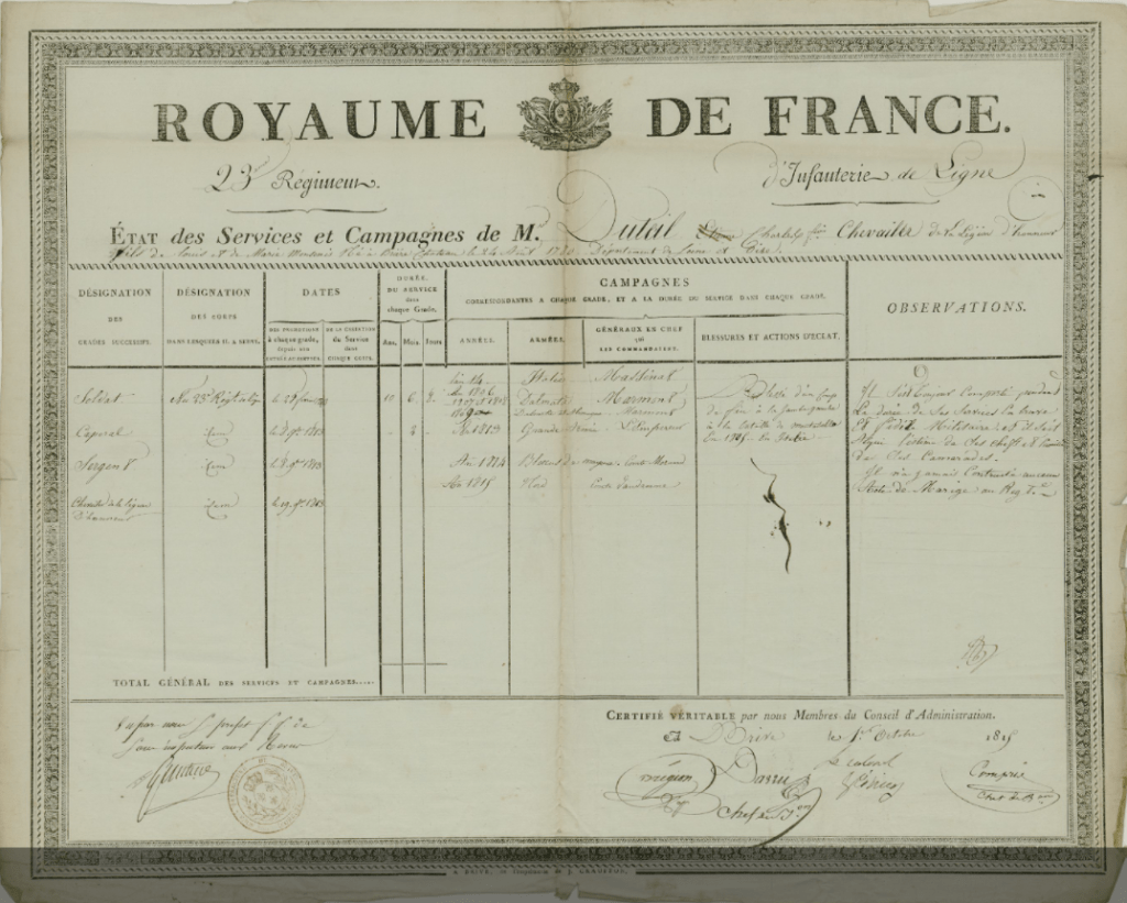 Bien que Charles ne soit que le demi-frère de mon Jean Louis, il mérite qu’on s’arrête quelques instants sur sa vie. Contrairement à son père et à son frère, le jeune homme dédaigne un temps le métier de vigneron pour entrer dans l’armée de Napoléon en février 1803 en tant que soldat du 23e régiment de l’infanterie de ligne.