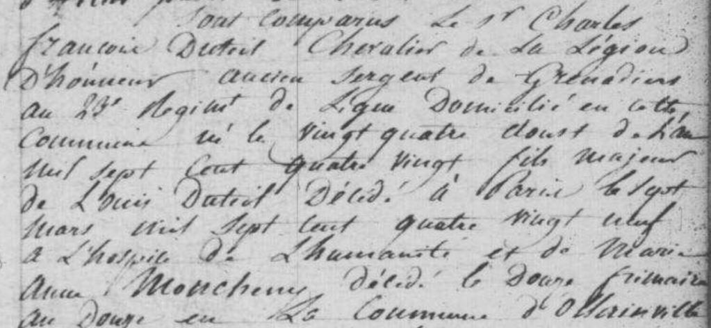Après 15 ans de bons et loyaux services dans l’armée impériale, Charles prend sa retraite et rentre à Bruyères pour y fonder sa famille. Nul doute que le jeune homme aurait fait la fierté de ses parents, si seulement ceux-ci avaient encore été en vie. Louis s’est en effet éteint en mars 1789 dans un hôpital parisien, sans que l’on sache pour quelle raison il y a été admis, à seulement 39 ans. Marie Anne le rejoint en décembre 1803, peu après l’incorporation de leur fils dans la Grande Armée.