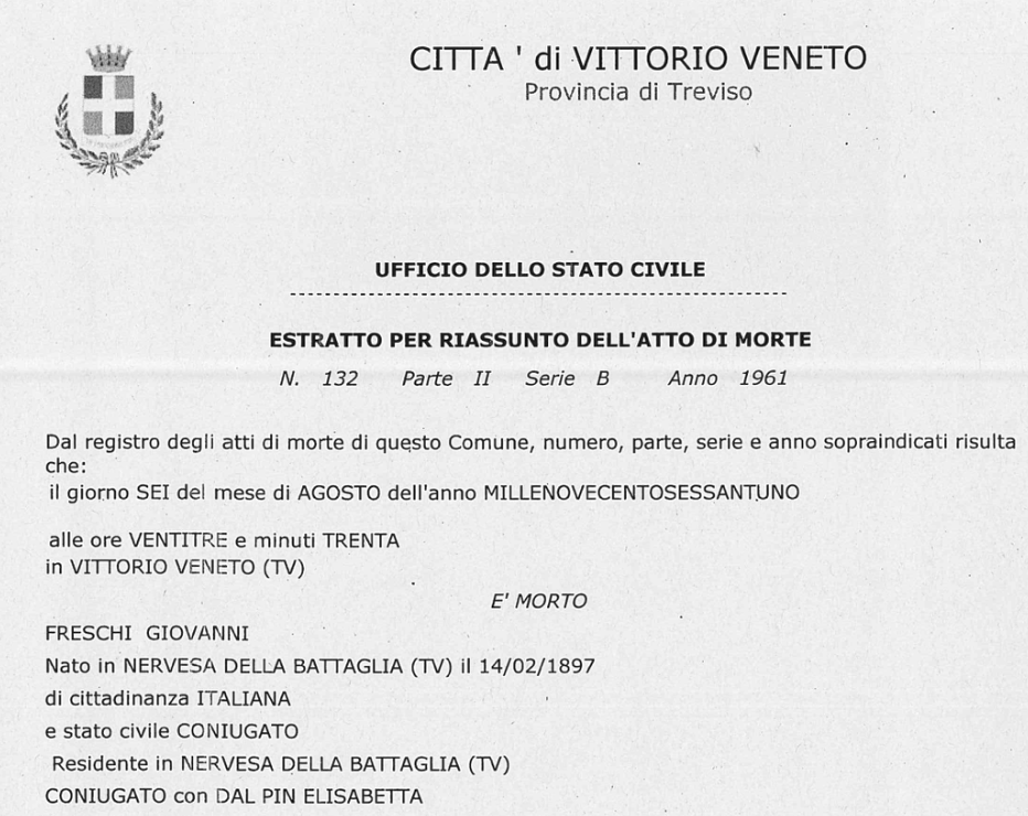 Dans tous les cas c’est à Vittorio Veneto, une petite ville proche de Nervesa, qu’il décède en 1961, à 64 ans. En tant que Giovanni, citoyen italien.