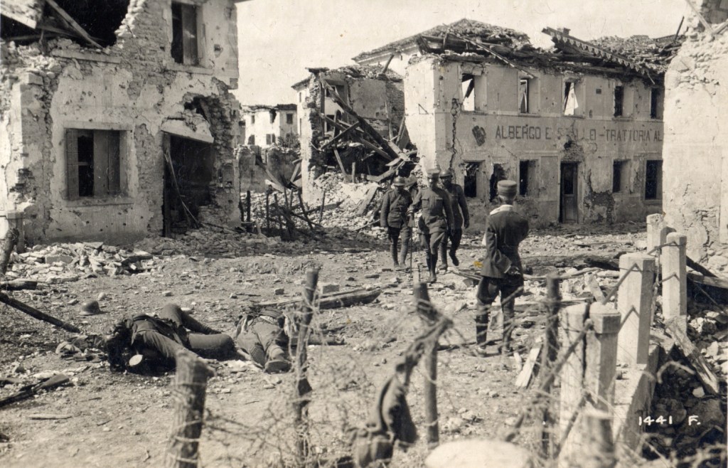 2 ans plus tard, la guerre s’invite à la porte de leur maison et ce qu’on appellera la bataille du Solstice débute. L’armée austro-hongroise tente une percée des lignes italiennes pour se rapprocher de la vallée du Pô. Mais les italiens, ayant eu vent de leurs plans, ont attaqué les premiers, faisant de nombreux morts du coté de l’ennemi. Malgré tout, les autrichiens réussissent à prendre le Montello et Nervesa le 15 juin 1918. Ils ne l’occuperont que quelques jours avant qu’elle ne soit reprise par les italiens le 21, au prix de beaucoup de bombardements, et de nombreuses pertes. La ville est libérée, mais entièrement détruite.