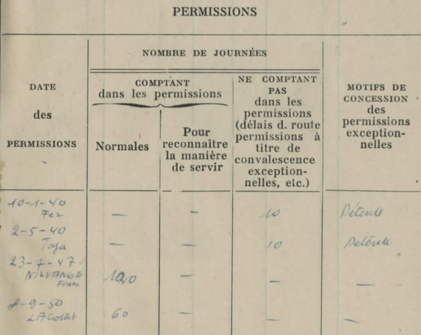 Les 4 seules permissions qu’Erpino aura pris durant la totalité de son service – Livret militaire d’Erpino – Archives Légion étrangère