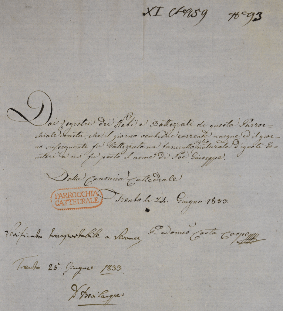 Le père de la future épouse se prénomme Noè et ne connait rien de ses origines. Il est né le 22 juin 1833 à Trento, une ville d’environ 50 000 habitants située dans la vallée de l’Adige qui fait alors partie de l’Empire austro-hongrois. Il est abandonné le jour même par ses parents dont on ne saura rien, et est recueilli par les ecclésiastiques du Dumo di Trento, la cathédrale de la ville. Il y est baptisé avant d’entreprendre son premier grand voyage alors qu’il n’est âgé que de 5 jours.