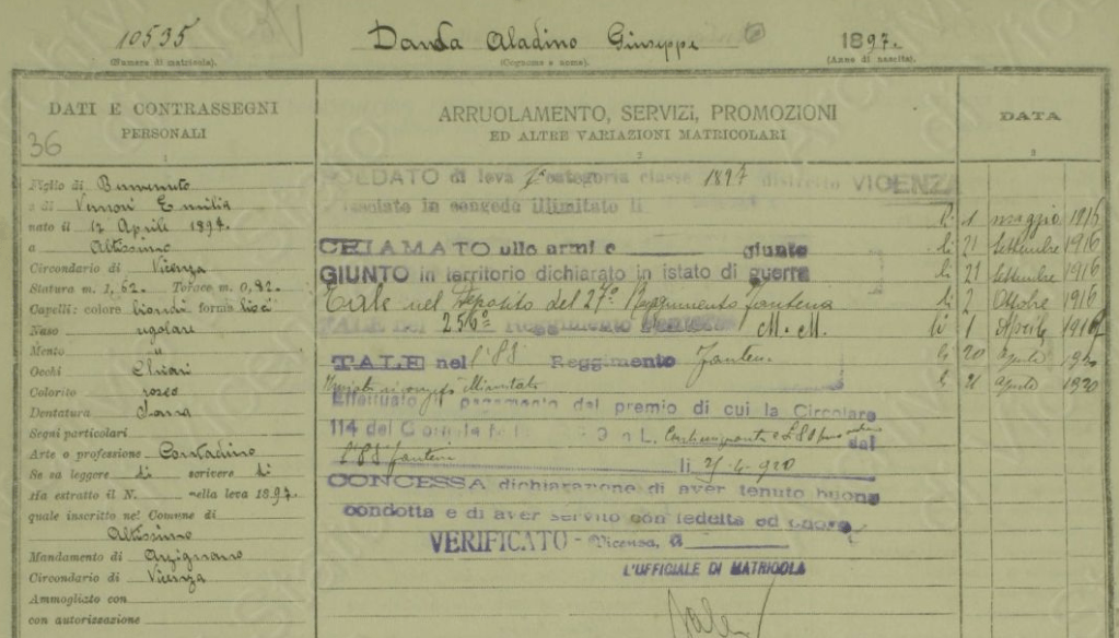 Extrait de la fiche matricule d’Aladino – Archivio di Stato di Vicenza