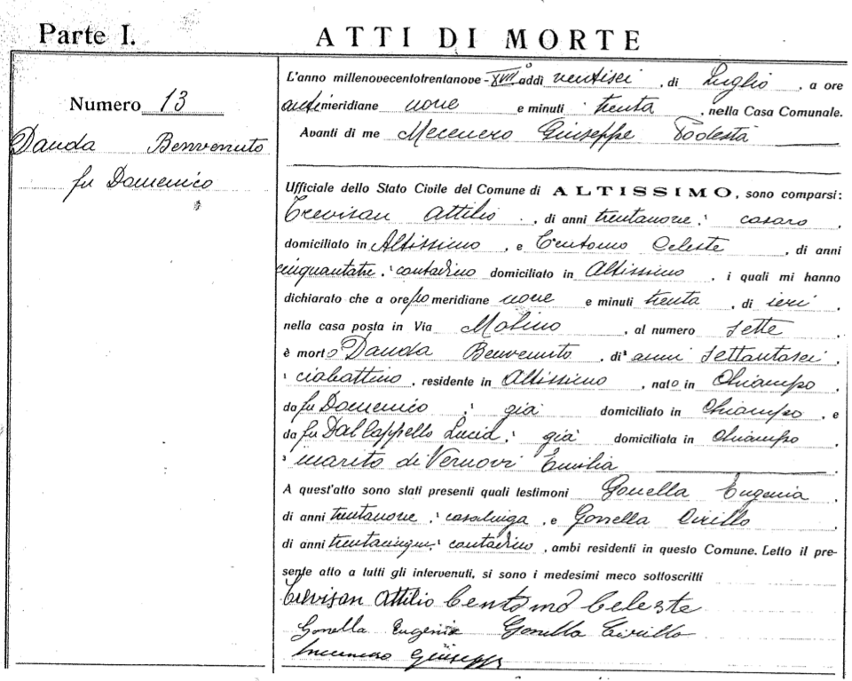 Acte de décès de Benvenuto – Archives municipales d’Altissimo