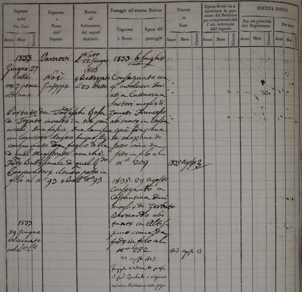A Trento, il n’existe encore aucune infrastructure pour s’occuper de ces enfants abandonnés, mais la ville a des accords avec celle de Verona, qui fait partie du royaume lombardo-vénitien sous domination autrichienne. Les enfants trouvés à Trento sont donc rapidement envoyés à Verona, à près de 100 kilomètres de là, où les attend un orphelinat et un réseau de nourrices pour prendre soin d’eux. Noè arrive le 27 juin 1833 à la « casa degli esposti » (la maison des exposés), l’orphelinat de Verona. Une fois récupéré par le personnel, il est enregistré, vacciné contre la variole qui fait des ravages, et le peu qu’il porte sur lui est répertorié : deux langes, deux chemises, une couverture, un document de voyage l’autorisant à passer la frontière et son acte de baptême. Il ne restera que quelques jours à l’orphelinat, le but des autorités étant de placer les enfants dans des familles nourricières qui prendront soin d’eux jusqu’à leurs 15 ans environ, contre rémunération bien évidemment.