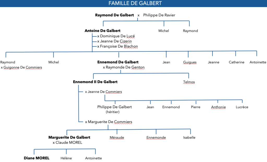 Leur union sera féconde et Jeanne mettra au monde 6 enfants, quatre garçons et deux filles. Philippe, l’ainé, héritera des fiefs acquis et à venir de son père et perpétuera la lignée des Galbert, tandis que ses trois frères entreront au service du Roi comme officiers et ne se marieront pas.