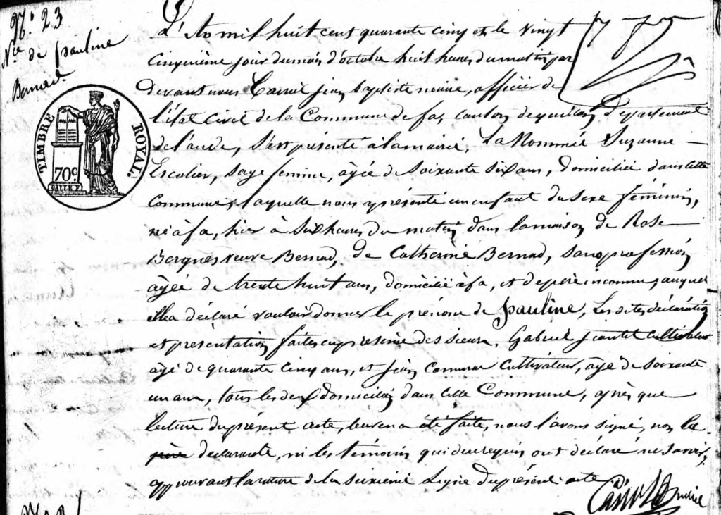 Acte de naissance de Pauline Bernad – AD de l’Aude