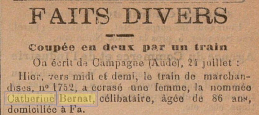 Le 23 juillet 1889, Catherine Bernad, une vieille dame de 82 ans, quitte à pied son domicile situé à Fa, dans l’Aude. Bien que sourde, pratiquement aveugle, ou en tout cas fortement myope, et atteinte d’une déformation de la colonne vertébrale, elle n’hésite pas à parcourir les quelques trois kilomètres qui la séparent d’une des chapelleries de la région installée au bord du fleuve, afin d’amener le déjeuner à quelques ouvriers du village qui y travaillent. Ce n’est pas la première fois qu’elle emprunte ce chemin. Pourtant, ce jour-là, elle semble se tromper de route et se retrouve sur la voie de chemin de fer qui longe l’Aude. Elle se retrouve soudain face à un train qui, jusque alors caché par un virage, ne peut s’arrêter à temps. La pauvre femme, percutée de plein fouet, passe sous les roues du train et son corps est coupé en deux en une fraction de seconde, de l’épaule gauche à la hanche droite. Les autorités dépêchées sur place ne peuvent que constater le décès, impuissantes face à cette tragédie. Une horrible mort pour une malheureuse infirme dont la vie n’avait déjà pas été un long fleuve tranquille…